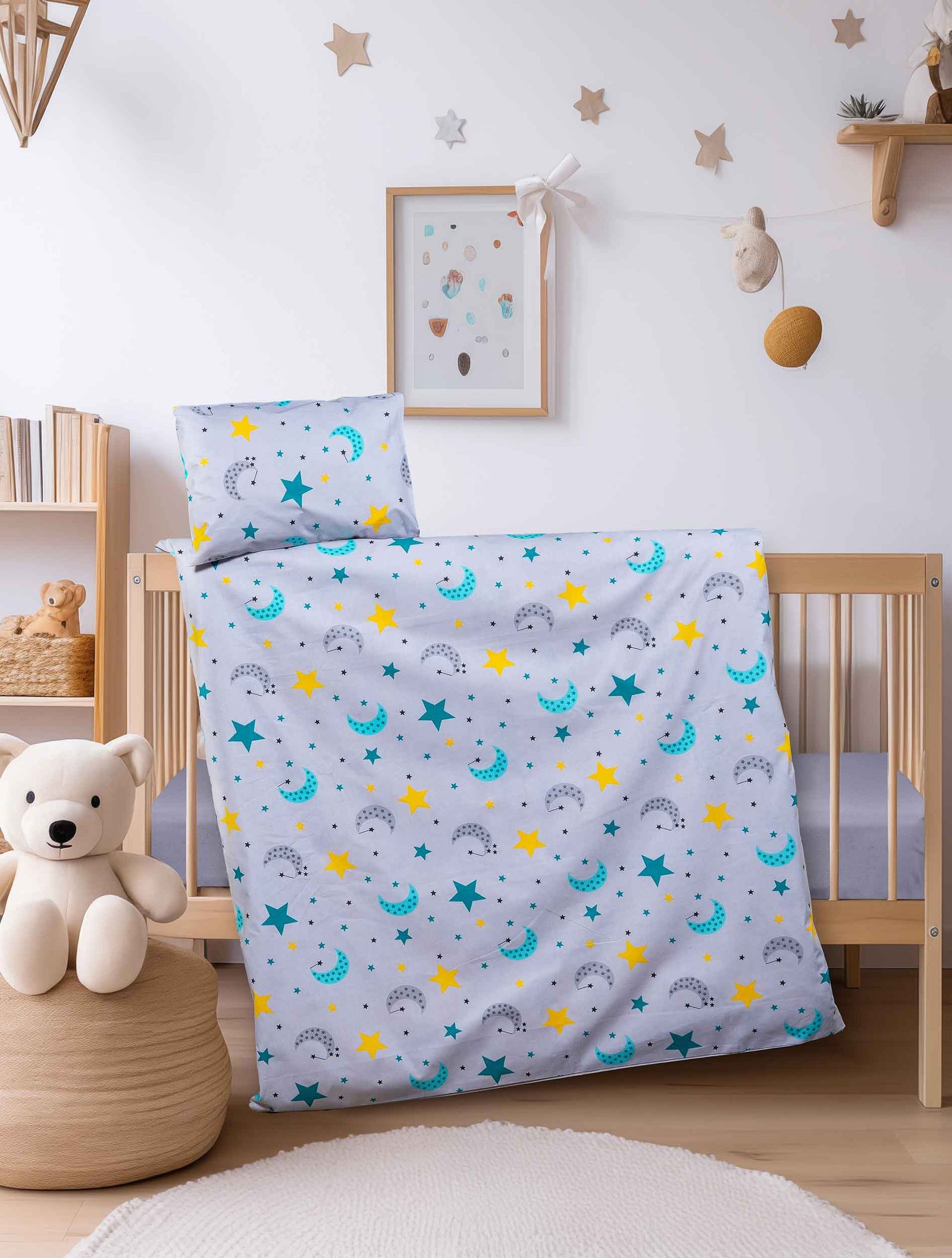 Σετ σεντόνια κούνιας με λάστιχο: 120 x 170 + 70×140 + 15 + 1 μαξιλαροθήκη 30 x 40 εκ., Σετ σεντόνια κούνιας: 120 x 170 + 1 μαξιλαροθήκη 30 x 40 εκ., Σετ σεντόνια λύκνου: 70 x 120 εκ.